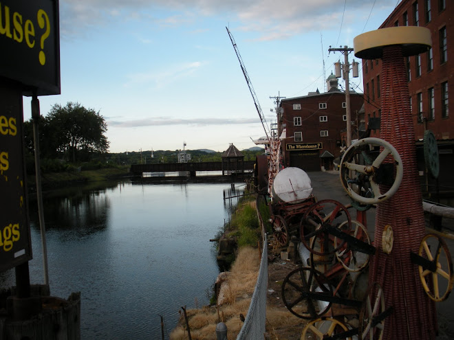 The end of this building reaches the new brick walk by the canal. You can look East down the length of the old water way and see Mt Holyoke rising in the distance framed by the old factories, mostly empty and boarded up, that were once powered by the Connecticut River. The dam is there at the eastern limit of the city, and as the world struggles with declining oil supplies, this place may thrive again. Close by is the rich farmland of the valley and the green mountain range beyond where there are streams you can drink from. A couple of miles or so beyond the dam, in rich bottom land along the river is a long stretch of family gardens. Walking through the fields there, the sun finally out after days of rain, I felt like I was back in Puerto Rico. Our studio space is big, framed by massive beams and timber posts. I don't yet know what kind of machinery was here, but down the wide hallway outside is a barred door way, and beyond the door a dim, misty corridor at the end of which repose the giant gears of the water wheel. The ruins of an old economy are all around us, but the massive buildings still contain the energy that constructed them and the steady coursing water could power some new economy. On a recent night I smelled woodsmoke and heard the breaking of boards. In a corner of the parking lot where the old factory walls meet several men and a woman sat on crates talking and laughing around around a small fire. People have come here to salvage what they can from the great wrecks of abandoned factories, to gather around a fire under the dark brick walls built in another age, like post apocalyptic travelers camped among the ruins. There was moonlight on the canal.